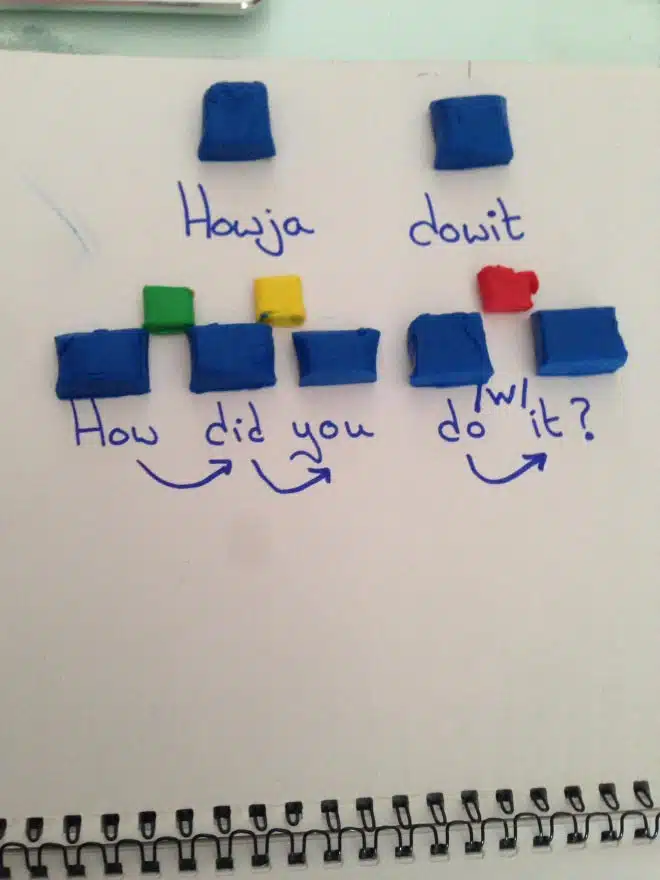 For connected speech, I normally ask students to put one block for each word they hear and then change it as they hear how words become connected. They can also use different coloured blocks for the different types of connected speech.