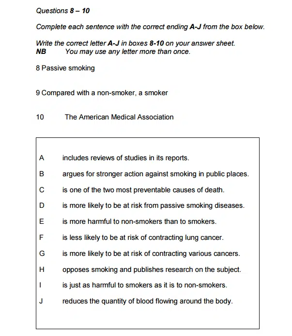 In IELTS reading, might be asked to complete a ‘matching sentence endings’ question type. In this question, you will be given a list of incomplete sentences with no endings and another list with possible endings. Your job is to match the incomplete sentences with the correct ending based on the reading text.