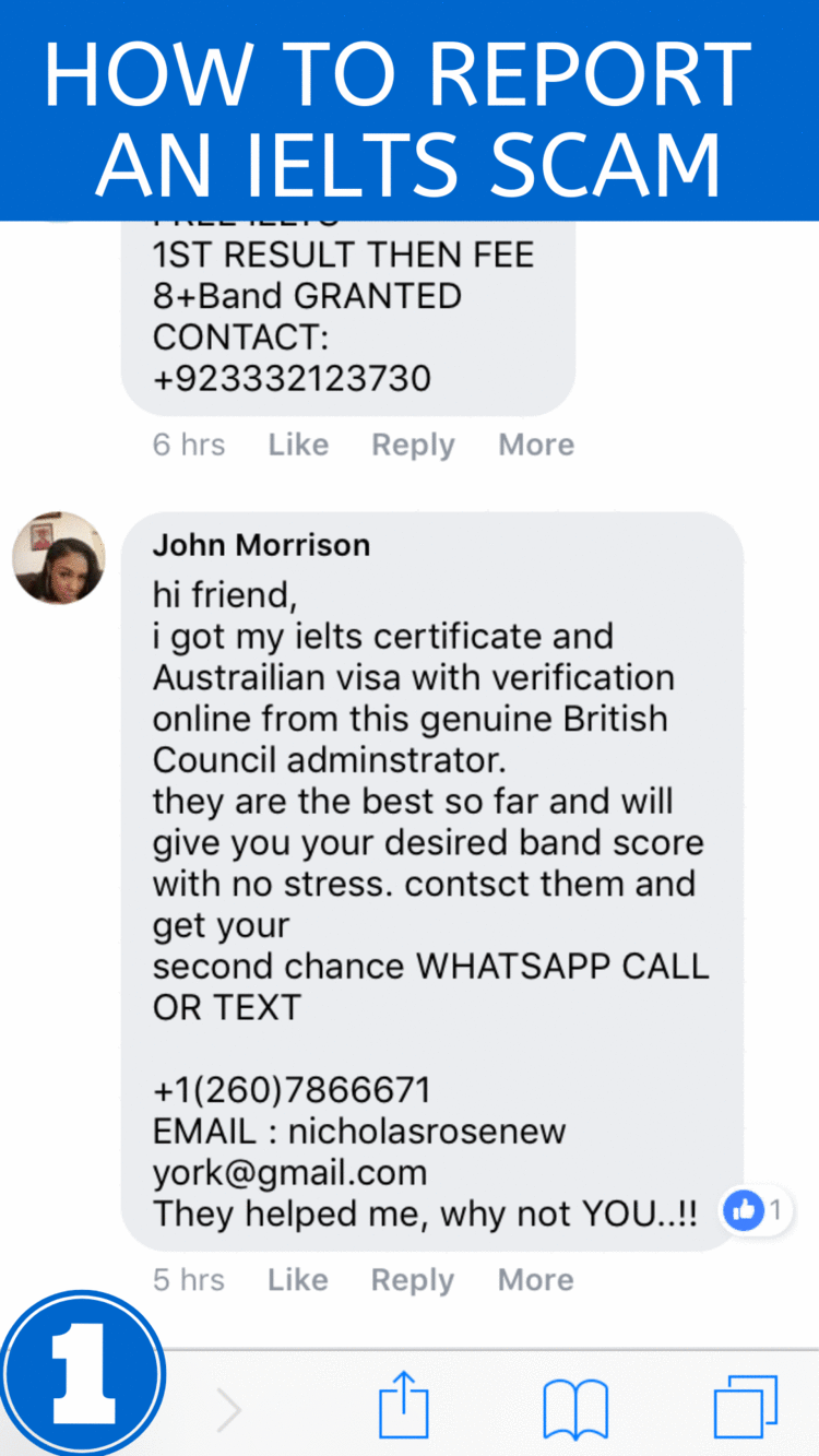 I won’t insult your intelligence by informing you that these are scams which will result in you losing a lot of money. However, to stop thieves stealing innocent money from innocent IELTS students, you need to do more than ignore such posts. Do your fellow pupils a favour and report them. The gif below will show you how.