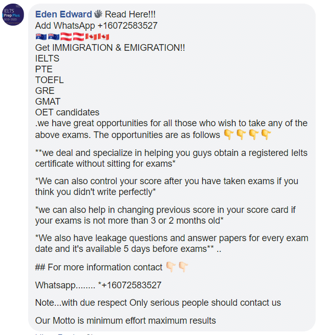 One recent trend within IELTS Facebook groups is scam artists convincing desperate test-takers that they can buy the IELTS certificate without even taking the exam.
