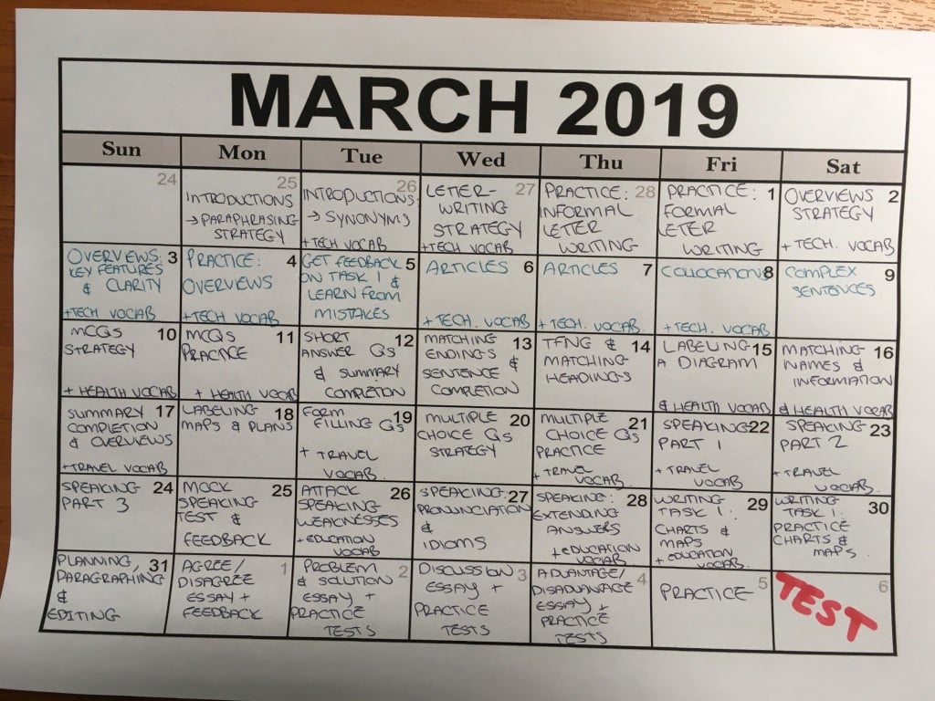 NOTE: this study plan is just an example and is not suitable for your own use. It’s important that your action plan suits your needs and weaknesses. I found the template by Google searching ‘March calendar 2019’ – you can do the same, draw out your own or use the calendar on your phone. Whatever works best for you.